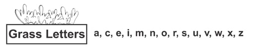 Letters that we write exactly between the two middle lines, for example, a,c,e,i,m,n,o,r,s,u,v,w,x,z are known as the grass letters.